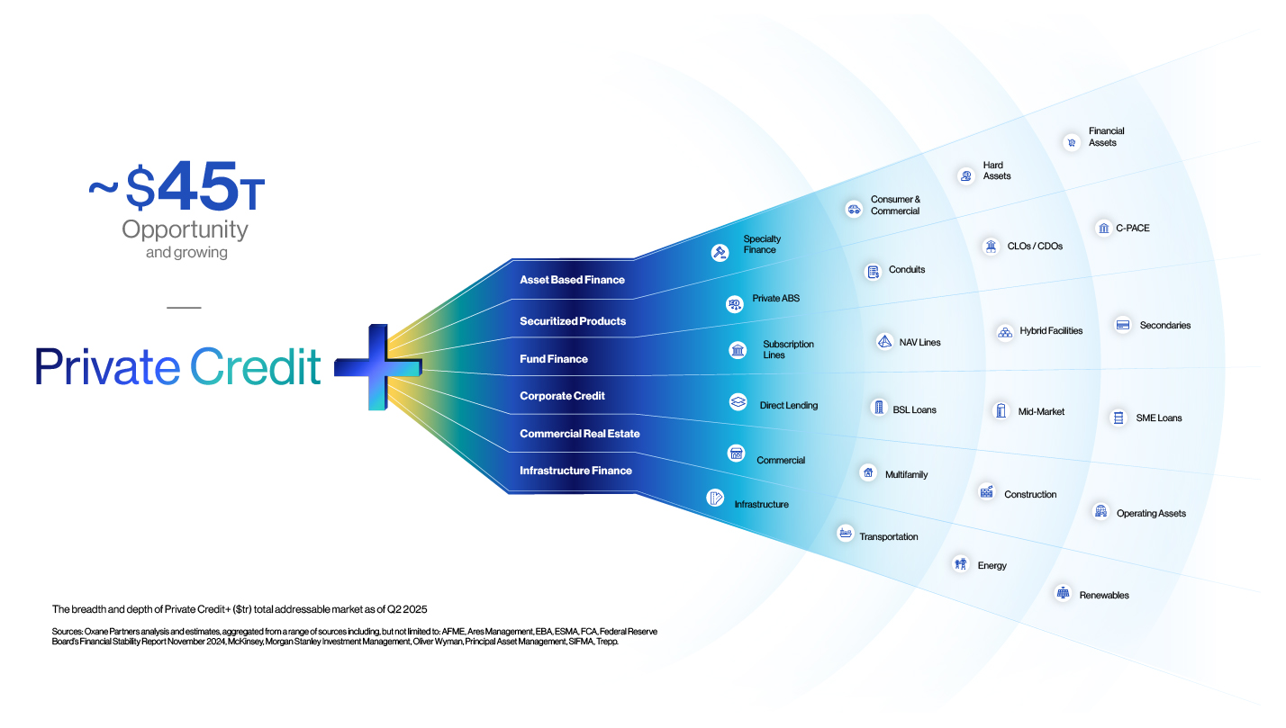 Private Credit+ unshackles private credit from the limited scope of direct lending to an opportunity that is orders of magnitude larger. When viewed through the Private Credit+ lens, the total addressable market expands to $45 trillion by our estimates - more than 30 times larger